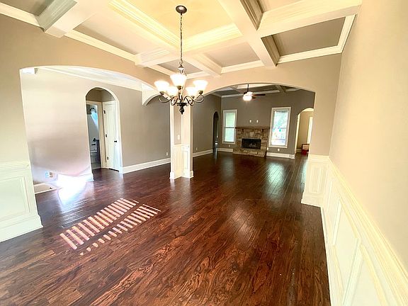 Living room with Coffered Ceiling designs 3 Full Bathrooms 5 Bedrooms, one room potentially used as an office Dining room with coffered ceilings 3 Car Garage with and exit door with baseboards Natural Gas connection for BBQ grill in back patio All kitchen appliances included Heavy Duty Gas Stove Front porch Master Bathroom includes separate tub and tile shower and dual sinks Attic space for storage Ceiling fans in all bedrooms and living room Fireplace with a gas starter 65 Gallon water heater Pre-wired for a security system Freshly painted interior and exterior Pantry Beautiful rose garden Playground swing set included Beautiful trees in the backyard keeping the household privacy