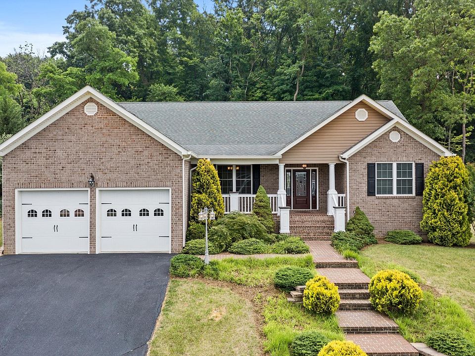 I fell in LOVE upon 1st visit to this home-come see why! The traditional touches hold their own in this former model home. Terraced brick paver steps lead you up to the covered front porch. Enter in to find a well laid out floor plan with split bedroom design and One level living. Hardwood floors flow in the main living areas - the Living Room has cathedral ceiling and gas log fireplace connecting to Dining Room with beautiful trim and a spacious kitchen with granite counters, lots of cabinet space and eat in breakfast nook. Large Primary Bedroom has roomy walk in closet and en suite bath with walk in shower and soaker tub. 2 more generously sized bedrooms round out this beautiful home. More features include 2 car garage, Rear Deck backing up to wooded space and a Conditioned crawl space. We hope you all will come for a visit Today!
