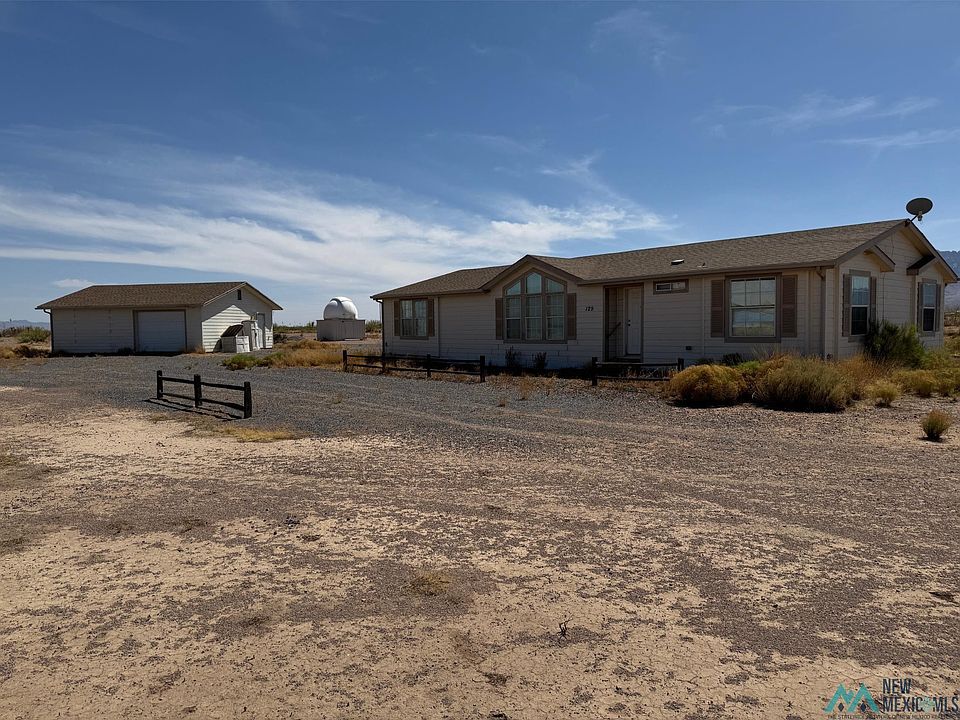 For sale is this exceptionally well-maintained 3bd/2ba manufactured home on a solid permanent foundation + a separate large garage/workshop + a complete professional-level astronomy observatory (sorry, no telescope), all on 10 spacious acres in the desirable Amigos del Cielo (airpark) Subdivision near Rodeo, New Mexico, USA. Professional and serious amateur astronomers alike covet this area for its exceedingly dark night skies (Bortle-1 ranking). The 10 acres is gently sloped toward the east with native cacti, yucca varieties, grasses, mesquite, creosote and wildflowers. From anywhere on the property there are inspiring views of the surrounding desert lands and nearby mountains ranges. The approximately 10,000-foot high Chiricahua Mountain Range dominates the western skyline, while the nearby Peloncillo Mountains loom dramatically on the eastern horizon. This particular property is situated at the eastern boundary of the subdivision with expansive adjacent ranch lands bordering directly to the east. The home itself features a modern open floor plan with vaulted ceilings invoking a feeling of extra spaciousness, plush carpeting, central air conditioning and heating, a private domestic well and septic system. The many windows throughout the home invite the outdoors inside and impart a bright and welcoming ambiance. As a special bonus, this beautiful home comes completely furnished, so just pack your toothbrush, favorite book and pet, and move in with zero hassle. Furnishings (all in very good to excellent condition) that convey with this sale include: three living room recliners, small book shelf, coffee table, side (lamp) tables, a queen-sized bed, window coverings (blinds) throughout, kitchen utensils, dishware, glasses, pots and pans, a Mr. Coffee, toaster oven, dinette set, bar stools, lamps, flat-screen TVs, artwork, and more. The home office (in one bedroom) comes fully equipped with a Dell desktop computer (+battery backup unit), monitor, ink-jet printer, office desk and chair, bookcase, Starlink antenna system, and more. The spacious kitchen includes all GE appliances (electric glass-top stove/oven, built-in overhead microwave, side-by-side refrigerator/freezer, and dishwasher. The main bedroom features a large walk-in closet on one side and a very spacious bathroom with a skylight and walk-in shower on the other side. The detached garage/workshop also comes completely outfitted with numerous modern hand tools (e.g., DeWalt drills, circular saws, sanders, reciprocating saw, compound chop/miter saw, double wheel grinder and more), several ladders, wooden work benches, cabinet shelving, and more. There are also several new 4x8 sheets of 1/2 inch plywood, several new 8-ft 2x4s, other miscellaneous lumber, and roof shingles. Finally, there is a professional-level astronomy observatory with an automated rotating dome system and a approximately 7-feet high 1/4 inch thick steel pier for stable telescope mounting. The observatory is equipped with a electric winch unit for lifting/positioning the telescope into place on the pier mount, as well as a large industrial step ladder/platform unit with safety hand rails for accessing a pier-mounted telescope system. Finally, the property has access to a HOA-maintained gravel airstrip for small aircraft. Thus, it is possible to fly in and out of the subdivision. Taken together, the many special features of this property, combined with the included home furnishings, workshop tools, building materials and pro-level observatory make this a superb investment at the asking price. Note that HOA rules are very mild with very low annual fees. To not miss out on a great offering at an affordable price, consider scheduling an in-person viewing at your earliest convenience. Please note, our brokerage does not entertain sight-unseen transactions.