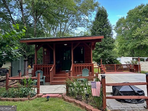 Looking for a little piece of Paradise to enjoy the N. Ga. Mountains, or just to park your RV? Plus, full hook-ups for water, sewer, electric on this level lot with big concrete pad that backs up to green space! Come see this studio style cabin that is stick-built with a 14-foot-long front porch with wicker swing to sit and enjoy the quiet serenity on this Fishtail Circle! It is the perfect side-kick, mancave, or she shed to your RV and has its own Heat/Air! The double wide driveway will fit a larger RV, has a large concrete pad, fresh gravel drive and can still fit 4 plus vehicles! There are nice shade trees surrounding the cabin, a grilling deck with bench seats perfect for entertaining and a Rubbermaid style storage shed including a Honda push mower! Inside are ceramic tile floors, wood walls, and a vaulted wood ceiling with a fan. Furnishings that stay are the daybed couch with under storage, built-in end tables, a corner cabinet plus vaulted storage area. You'll create a lifetime of memories here, whether you're relaxing, fishing, or participating in the ongoing activities within Paradise, a gated community. Enjoy the pool, pavilion, clubhouse, and planned activities! The location is central to all the fun in nearby mountain towns and events, just minutes from Cleveland, Helen, Dahlonega, Clarkesville, and Blairsville. Shop, dine, fish, hike, and visit vineyards-the possibilities are endless! Please note that Paradise is a vacation resort community that does not allow full-time living. The listing agents are owners in Paradise, so feel free to call for a tour or more detailed information about Paradise and this property.