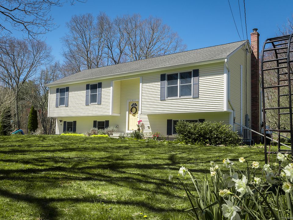 Spacious one owner home built 2002 on just over 1 acre - plenty of yard with room to add gardens in the level area out back. Property is in RU-20 zone that allows for multifamily; home has potential In-Law unit downstairs. Upstairs: Main Bedroom Ensuite Full Bath (Tub_Shower Combo), Two Additional Bedrooms, and Full Main Level Bath (Shower). Wider Hardwood floors (Pine) throughout. Composite Deck thru sliders off Dining Room. Finished Basement has separate entrance with Bonus Room along with a Studio Area with full bath (Shower) and Kitchenette. Both finished downstairs areas include a Propane Vented Heat Unit in addition to the oil baseboard heat. Lots of Light in this home with many windows and plenty of storage with closets throughout. Wider Offset Hallway Sections that allow for more privacy for the bedroom area. Lighted Closets throughout the home. One Car Garage with room for work area or storage. A/C unit in living room ceiling is vented outside. Pulldown stairs to floored attic for storage. 2.4 miles to Mystic Drawbridge. Easy Access to I-95, Subase, Coast Guard Academy, EB. RU-20 Zoning allows for 2 units or In-Law Apartment. Property currently listed as Single Family, but buyer could request change to 2F or In-Law with town approval and meeting all necessary requirements.