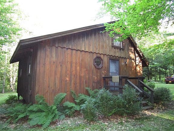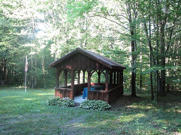 One-of-a-kind Craftsman cabin in the woods. Relax and recharge in this peaceful sanctuary on a seasonal road. If you want to be off the grid, but comfortable, this is what you are looking for! Custom built log home on the edge of State Land gives you access to thousands of acres of wilderness. Wired to code, the gas generator gives you plenty of light and energy and the woodstove heats the space nicely. Comprised of 4 structures,the 16x20 concrete pavillion makes a nice summer kitchen, extra gathering space and the new 1 car garage ads secure storage. The generator is housed in it's own shed that also has storage space. Water is sourced from the hand-pumped well for your use inside the cabin. You will want to spend all of your time on the oversized screened porch that overlooks lush green forest. Gravity fed shower means you can be comfortable here for days!