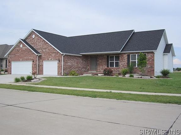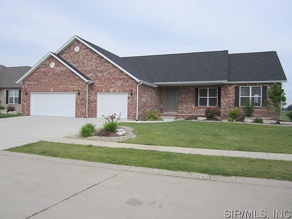 Call SUE WOODEN, Listing Agent today at 618-444-8593! Open floor plan with 12' tray ceiling in great room & dining area. Deluxe Master bath with HIS & HERS vanities and walk-in closets. Maple cabinets, tile, hardwoods and granite counter tops. Awesome built-in showcase with fireplace. Large first floor mudroom/laundry. Rough in plumbing, 3 lookout 4x6 windows, covered porch is 6 x 22., Trex deck 12 x 16. Oversized 3 car garage, landscaped, eyecatching entrance with 1 acre lake and fountain.