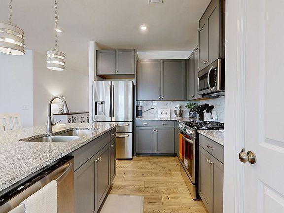 The spacious great room features a cozy fireplace and flows seamlessly into the kitchen, where you'll find sleek gray cabinets, granite countertops, stainless appliances, and a pantry. Durable laminate/LVP flooring runs throughout the main living spaces, adding both beauty and practicality.