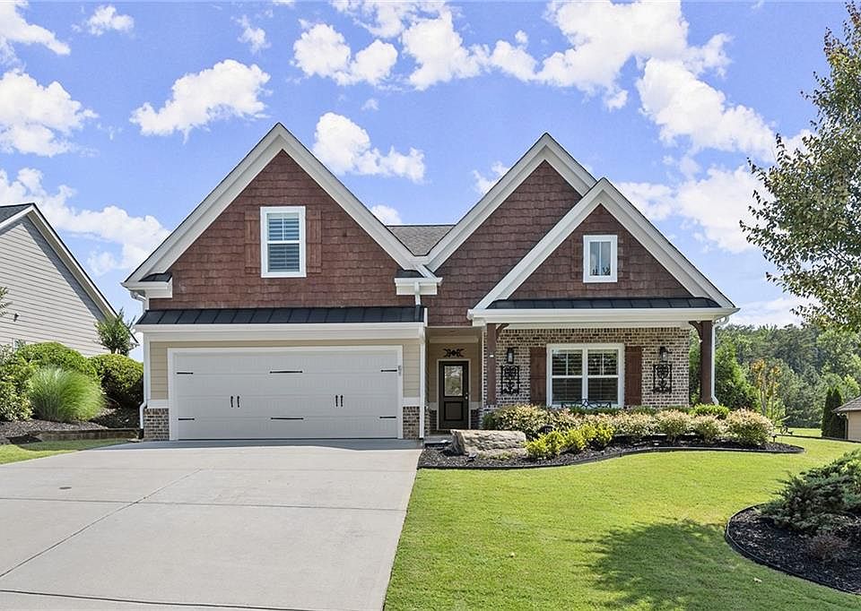 STUNNING MOUNTAIN VIEWS & GOLF FRONT RETREAT! Immaculately maintained, craftsman style mountain escape secluded in the back of gated Lake Arrowhead with jaw dropping golf course views from the lush, fenced in backyard. Stepless entry opens to a traditional dining room on the right, and a massive open living space overlooking a wall of windows to your private backyard oasis. Open concept floorplan, en suite guest bedroom, and oversized primary suite (with sauna!) all on the main allows for easy everyday living. No carpet on the main. Spacious white chef's kitchen with double ovens, high end stainless steel Bosch appliances, granite countertops and separate granite island. Abundant natural light pours in through the oversized sun room, with new textured wood ceiling, overlooking the panoramic mountain views. Relax on the covered stone patio to enjoy more tranquil nature views accessible from the primary suite. The upper level showcases a sitting area, home office, two guest bedrooms perfect for your overnight lake guests, or keep one as a gym. Two walk in attic spaces for ample storage. Nicely landscaped on all sides with irrigation system. New Roman blinds in the sun room, new 4 in plantation shutters, new insulated garage door and garage openers, new textured wood on ceiling of primary bedroom, expanded storage space recently built into the attic, and new built ins installed in the closets. Unique property features include a whole house water filtration system, reverse osmosis drinking water filtration system, air purification system, separate house generator, and 250 gallon propane tank. Low Cherokee County taxes. Welcome home to your private mountain retreat from stunning Lake Arrowhead!