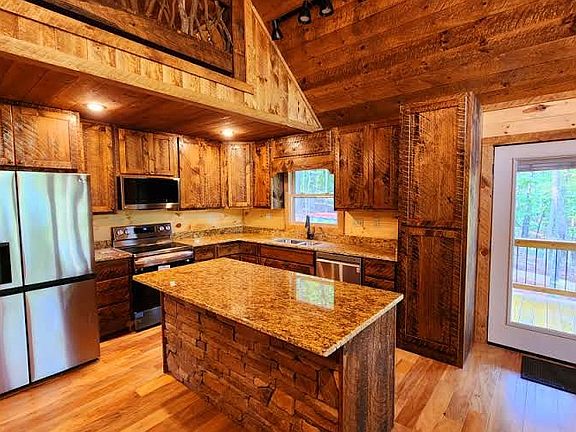 4 bedroom 4 tiled bath cabin located on 1.65 acre gentle sloping lot with mature hardwood for privacy. Enjoy the gourmet kitchen with granite countertops opening to the spacious living room with floor to ceiling rock woodburning fireplace. Rare master suite on each floor. Private deck from master suite on main floor. Finished basement with wet bar. Step outside to the large 12 wide screen porch with outdoor fireplace. This cabin has paved roads close to historic Blue Ridge, Georgia. Estimated completion date is August 2022. 2 owners' closets in basement. Great for full-time or rental.
