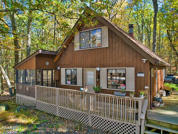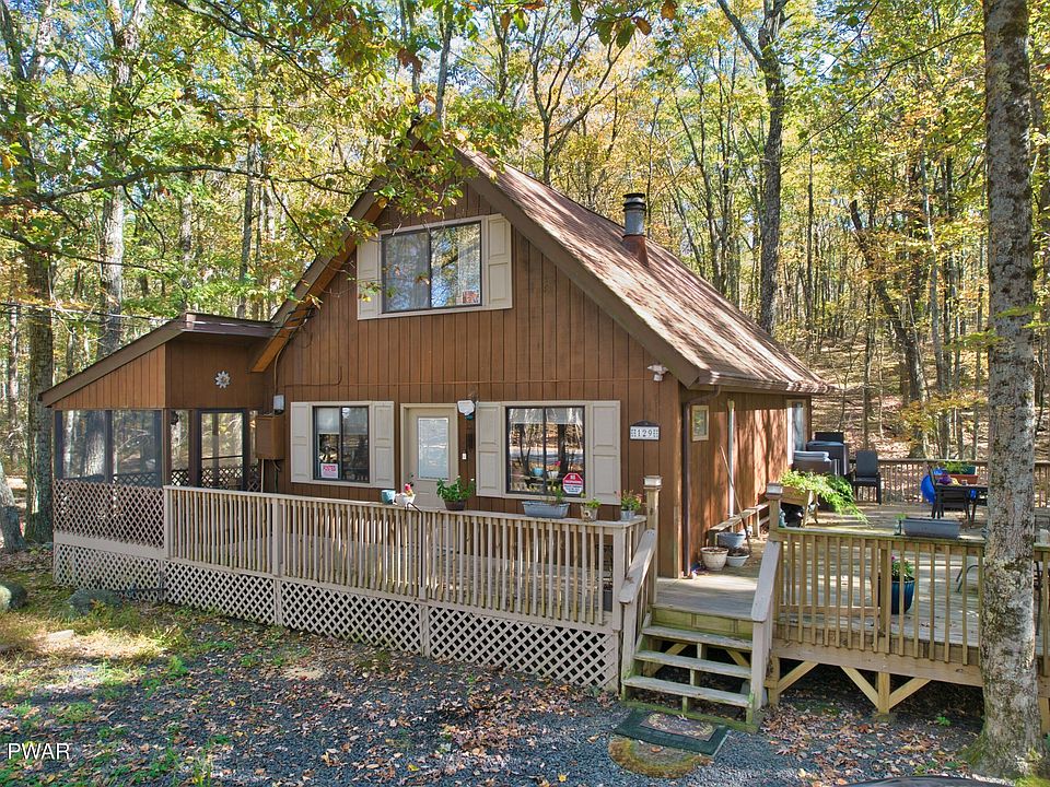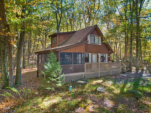 Welcome to your dream chalet in the amenity-rich community of Hemlock Farms! This charming three-bedroom, two-bath home offers a perfect blend of comfort and style. The main floor features a spacious living room highlighted by a stunning brick front wood-burning fireplace, creating an inviting atmosphere for cozy gatherings. The living room seamlessly flows into the dining area and a well-appointed kitchen, equipped with a newer oven/range and dishwasher.The main floor has a large bedroom with a convenient bathroom with shower and laundry making everyday living a breeze. Split units throughout the home provide efficient heating and cooling, ensuring year-round comfort. Venture upstairs to discover two generously sized bedrooms and a full bath, perfect for family or guests. Enjoy outdoor living on the screened-in porch or bask in the sun on the expansive deck, perfect for entertaining or relaxing amidst nature. This chalet is not only a beautiful home but also a gateway to the many amenities Hemlock Farms has to offer. Don't miss your chance to embrace the serene lifestyle in this delightful property!
