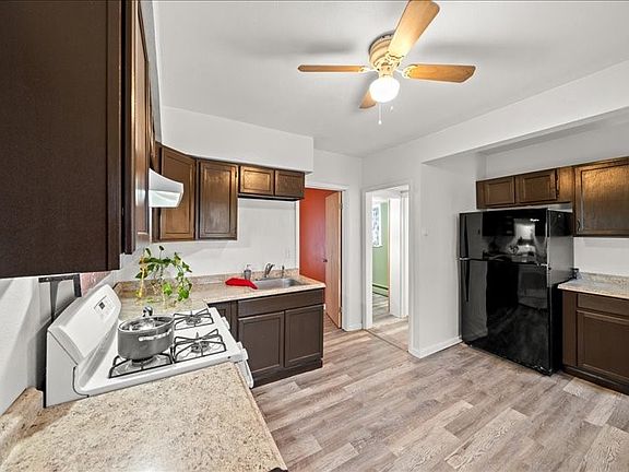 MOVE RIGHT IN, CHEAPER THAN RENT AND there is nothing for you to do!! FEATURES include: Brand new Vinyl flooring throughout, Newer Roof, Hot Water Heater and Boiler! Hot water baseboard heat. Freshly Painted! New surround sound bath with stylish new sink, light, and fixtures and stylish sliding hung door. Vinyl windows, newer driveway fitting 2 cars side by side. Ceiling fans, eat-in kitchen with pantry, refrigerator, gas stove, s/s sink. This charming house has a smaller manageable yard, walking distance to park, restaurants, and close to other shopping in area. This house will not last long!!