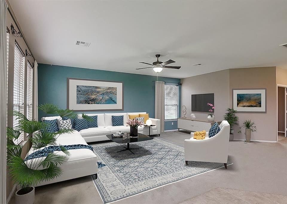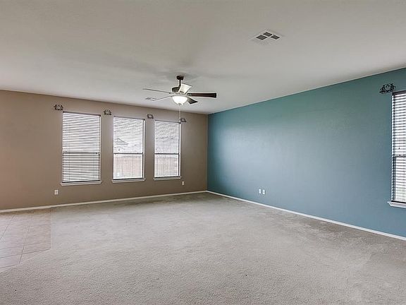 Built in 2011, this Leander two-story home offers a kitchen island, a walk-in master bedroom closet, a master bathroom with dual sinks, a balcony accessed from the master bedroom, a patio, and a two-car garage.