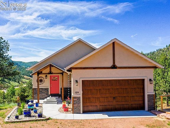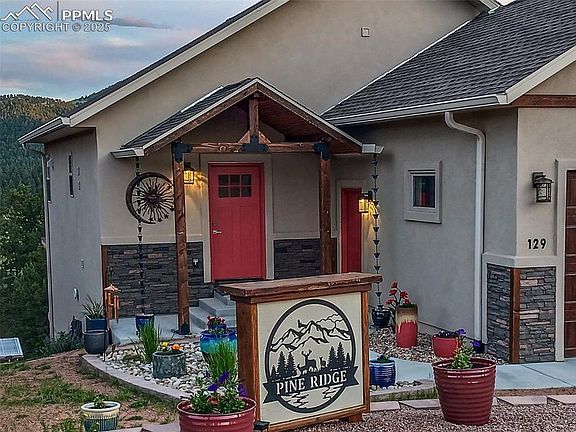 Beautifully crafted like new home located just 10 minutes from Cripple Creek! This stunning home is designed w/ low maintenance stucco & stone exterior & aluminum soffits. Located at the end of a quiet cul de sac, overlooking views Southwesterly, from 3 redwood decks, for outdoor enjoyment! Main level living flows wonderfully through an open concept great room to include luxury vinyl planked flooring throughout, while laundry room and powder room are conveniently located in the entry hallway. Kitchen includes a corner pantry closet, granite slab countertops, & Samsung stainless steel appliances, w/ a central island and counter-bar seating. Walk-out to the main level deck for the breathtaking views of surrounding mountains & rock outcroppings. Living area consists of vaulted ceilings, corner propane fireplace, an adjacent dining space. Owners' suite is situated w/ vaulted ceilings, a 4 pc. bath, dual vanities, as well as a walk-in closet. The lower level of the home includes 10 foot ceilings, a comfortable family room, walk-out to the 2nd deck, w/ hot tub included, overlooking the greenhouse. One additional bedroom exists on this floor, in addition to a 3/4 bathroom. An expansive storage & utility area w/ a water softener & sink, also leaves space on the opposite end for an additional bedroom where a framed-in future window is just behind the insulation. An attached 2 car garage is easily accessed from the cul de sac, & the property is located just minutes from the pavement. A 3rd redwood deck has been perched alongside the garage for the morning cup of tea! This property is designed w/ 9 engineered buttress walls, & efficiently built to withstand 100+ mile/hr wind gusts, making this home capable of withstanding the elements of time. Property has also been fire mitigated throughout. Community amenities include 2 pickle ball + tennis courts, pool, fitness room + sauna. You will not be disappointed! Many of the furnishings are included in the home.