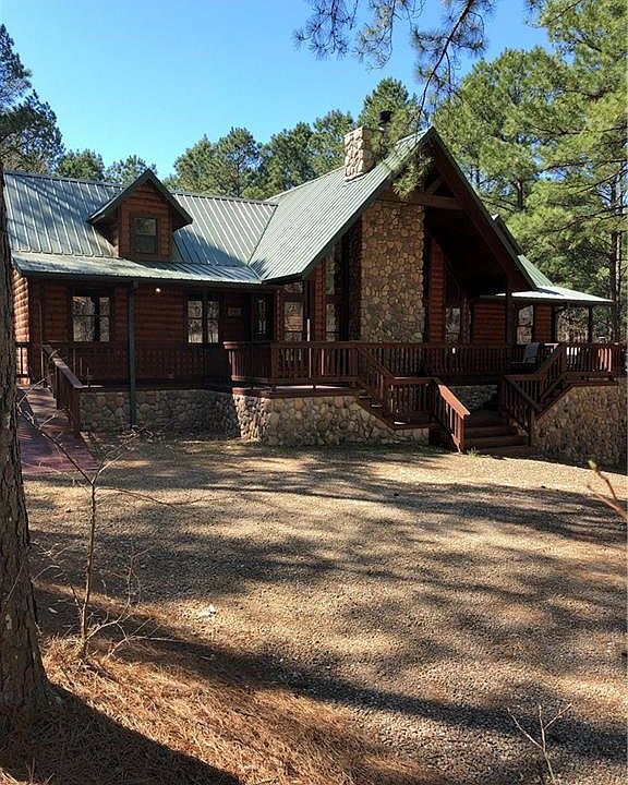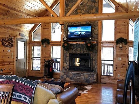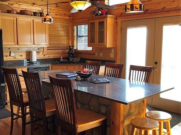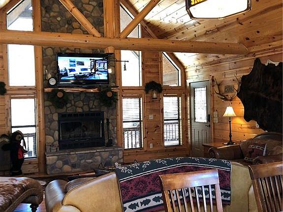 Dazzling 2 BR, 2 full bath one story log sided cabin with extensive exterior rock detailing in popular, deed restricted Northern Hills. Great room with gleaming floors, soaring ceilings & exposed beams, rock FP. Kitchen with black appliances, slab granite countertops & large island dining bar seating 8-10. Two very spacious bedrooms with walk-in closets, baths with granite countertops & tub shower combinations. Separate utility room. Expansive covered and open outdoor spaces. Fire pit. On approx. .85 wooded acres. Offered beautifully furnished and equipped, including hot tub. Minutes to the lake, state park, municipal golf & all Hochatown amenities.
