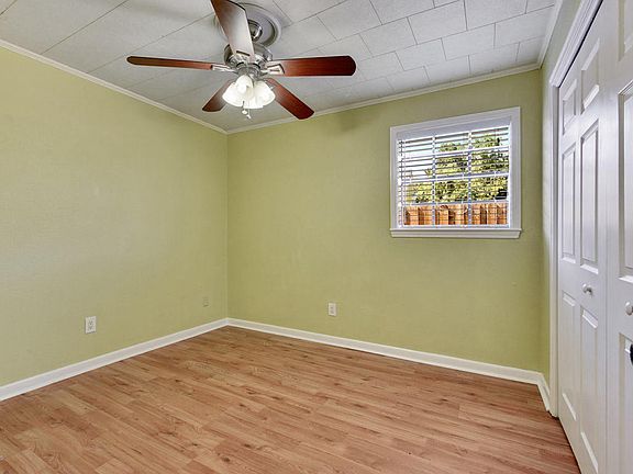 Unique home on beautiful corner lot in quiet subdivision. Nice landscaping front, back and enclosed courtyard with firepit. Backyard has a great in-ground gunite pool completely privacy fenced. Property has two large live oak trees, a magnolia tree, pear tree and satsuma tree. Plenty of shade in the side yard for lazy afternoon Bar-B-Ques. One guest bedroom and full bathroom downstairs. Upstairs is a loft bedroom with adjoining office. The master bath has a jacuzzi tub and separate shower. Living room has 14'+ ceiling with a wooden accent wall. Exit thru to the pool via a wet bar w/stainless steel sink. Interior recently painted. NO CARPET, all laminate and tile. Exterior trees trimmed and house ''soft washed.'' Roof replaced 2013, new electrical panel installed 2017.