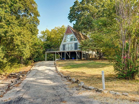 This striking three-story A-frame home in Big Aunt's Creek offers a rare blend of rustic charm, modern updates, and an ideal location just minutes from Table Rock Lake. Situated on a lush, oversized double lot with lake views, the property is perfect for weekenders, full-time residents, or investors. It is especially appealing to those living in the Springfield or Nixa area--this is the closest part of the lake, making it an easy and efficient 45-minute drive from Springfield. Whether you're looking for a peaceful retreat or a recreational haven, this home delivers both.The seller is motivated and relocating, and all reasonable offers will be considered. As an added incentive, the seller is offering a $5,000 flooring allowance. Inside, the home features over 2,000 square feet of living space, three bedrooms, and two and a half bathrooms. The main level boasts an open-concept kitchen, dining, and living area with a wood-burning fireplace. Kitchen appliances, including a refrigerator, double oven/stove, and dishwasher, are included. The second level offers a spacious living room with built-in bookshelves, a wet bar, a second fireplace, and a master suite complete with a spa-style shower enhanced with Bluetooth features. This level also provides access to a large wraparound deck ideal for entertaining or relaxing with a view.The third floor includes a private bedroom with a balcony, a half bath, and an overlook to the living space below. Numerous updates have been made throughout the home, including updated lighting, renovated bathrooms, and replaced septic lines in 2020.Outdoor amenities are just as impressive. A detached garage with electricity, hot tub hookup, and expansive fenced yard provide plenty of functional space. The yard features a fire pit, goldfish pond, and generous wraparound decking with a covered patio. The newly chip-and-sealed driveway adds convenience and curb appeal. An optional 10'x20' boat slip on a nearby semi-private three-slip d