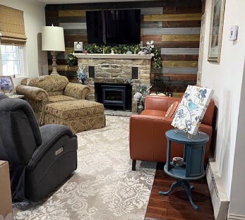 - Fireplace features: Stone, Wood Burning