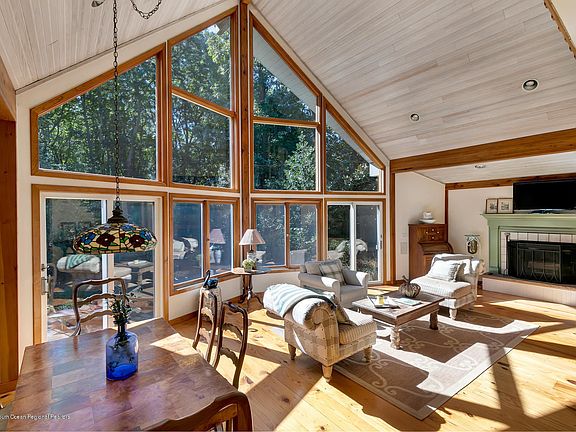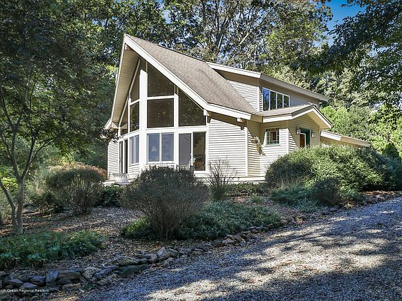 Ansell Adams setting for this special home and location, Called the Prow house, this post and beam home features a two story wall of glass and light filled living room. Wide plank floors and open concept kitchen with white cabinetry, SS appliances and featuring a black soap stone sink. Dining area and fireplace. Two nice size bedrooms on first level with full bath. Upstairs lofted master suite with winter water views of Sandy Hook and Hartshorne woods. Large walk in closet and master bath with jacuzzi tub and separate shower. Full basement with full bath and walk out. Plenty of storage or could be finished. Mature landscaping and large deck Trails for hiking and biking out your door as well as a short five minute drive to the Sea Streak ferry for easy commute to city.