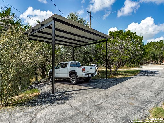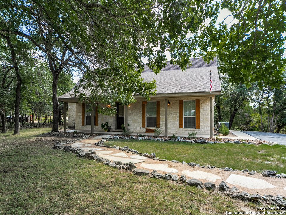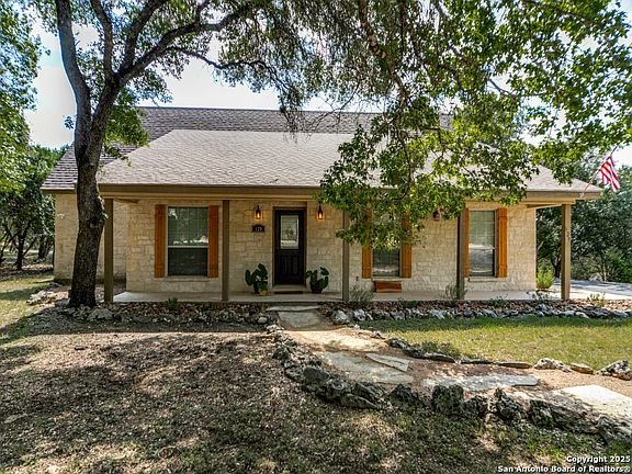 Beautifully updated Hill Country home with fresh outdoor upgrades! Extensive new landscaping enhances both the front and backyards, creating a welcoming and serene setting. The expansive front porch invites you to sit back and enjoy the Hill Country views. Inside, the spacious family room features a stunning floor-to-ceiling rock fireplace, vaulted ceilings, and abundant natural light. The fabulous kitchen offers butcher block countertops, a stainless steel farmhouse sink, and stainless steel appliances-perfect for everyday living and entertaining. The primary suite is a peaceful retreat with his and her closets, while the spa-inspired bath boasts marbled tile in the shower, double vanities, and a generous linen closet. Step outside to the improved backyard deck, ideal for relaxing, dining, or gathering with friends. A tall carport provides excellent covered parking, and the custom-built storage building offers plenty of space for tools, toys, and gardening equipment. This home combines the best of country living and modern comfort, all while being just minutes from Boerne, San Antonio, and Spring Branch. Exclusive community Guadalupe River park access for residents!