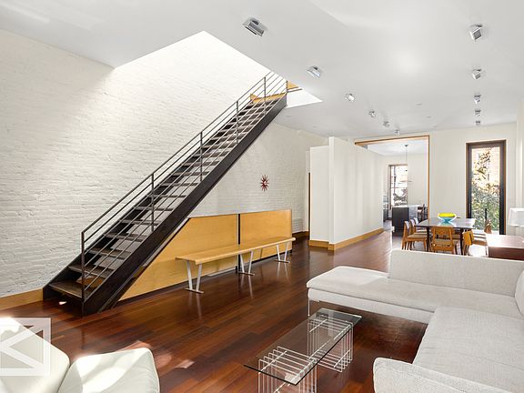 Situated on one of the most coveted and bucolic blocks of Park Slope, this elegant, 20-foot-wide brownstone seamlessly blends classic architecture with modern sophistication, all finished to the highest standards. Built in 1899, the home has been meticulously renovated to enhance its pure form, line, proportion, and finish, creating a dramatic triplex with a private, curated garden. *This townhouse also offers a garage space for an additional cost, conveniently located nearby.* Natural light bathes every corner of this townhouse, accentuated by a thoughtfully incorporated skylight that enhances the soaring ceilings and fills each room with a warm glow. Upon entry, you are greeted by a grand great room spanning over 40 feet, complemented by oversized, deep-set windows that line the room and welcome abundant southern light. The superb symmetry is accented by touches of steel and wrought iron as architectural details, showcasing the thoughtful design evident throughout the home. The expansive living and dining area, featuring exposed brickwork and steel accents, flows directly into an oversized eat-in chef's kitchen. The kitchen boasts custom cabinetry, professional-grade appliances, and a large center island. Two doors provide seamless access to a small private deck and curated garden. A floating steel staircase leads you to the second floor, where a spacious 30-foot entertaining area awaits. Its two-story atrium floods the space with light, creating a sunlit and airy loft-like feel. The generously proportioned primary suite features two exposures that welcome morning sunlight, a walk-in closet, and an en-suite bathroom with an oversized window, soaking tub, and shower. A separate laundry room with a full-sized washer and dryer adds practicality to this level. The top floor hosts two well-proportioned additional bedrooms, each with custom built-in closets, high ceilings, and clerestory windows that draw in natural light from the central skylight. An open walkway connects to a stylish hall bathroom, equipped with a double sink, bathtub, towel warmer, and ample custom storage. The triplex's crowning feature is the celestial skylight that bathes the entire home in sunlight. Nestled in the highly sought-after North Slope, this residence offers easy access to multiple train and bus lines, as well as the vibrant dining and shopping scenes along 7th and 5th Avenues, Flatbush, and Vanderbilt. Just around the corner is Grand Army Plaza, home to New York City's second-largest farmers market every Saturday. The location is at the heart of a cultural hub, with the Brooklyn Botanic Garden, Brooklyn Museum, Prospect Park, Brooklyn Public Library, Barclays Center, and Brooklyn Academy of Music all within easy reach.