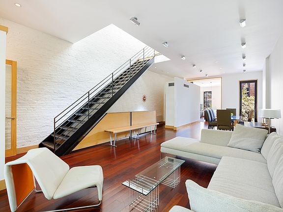 One-of-a-Kind Contemporary Brownstone Rental Beyond the traditional brownstone facade lies one of Brooklyn's most unique private spaces - a contemporary Soho loft meets Historic Park Slope. Featured in The New York Times for its stunning renovation, this one-of-a-kind upper triplex apartment is a design-lover's dream. Unique to this home is the sunlight streaming into every room, thanks to the innovative use of skylights and soaring ceilings. Upon stepping into the foyer, the glass paneled door reveals a light filled 41' living/dining space, with exposed brick walls, Brazilian cherry floors, 11.5' ceilings, plus oversized windows and doors. The generous eat-in chef's kitchen features custom cabinets, professional appliances, and large center island. Two doors provide seamless access to a small private deck and lush shared rear garden below. Ascend the floating stairs to the second floor where you will find a 30' living/media room with a two-story atrium allowing light to flood the upper two floors. Though vast, the second floor has a cozy atmosphere. Tucked away is a large primary suite with double exposure to capture the morning sun, a walk-in closet, ensuite bathroom with soaking tub and shower. In addition, there is a separate laundry room with full sized washer/dryer. The top floor has two large bedrooms with custom built-in closets, 10' ceilings and clerestory windows to capture additional sun from the huge center skylight. An open walkway connects the bedrooms with a stylish hall bathroom, which includes a double sink, bathtub, towel warmer, and tons of custom storage. The townhouse is strategically located in the North Slope with access to multiple train and bus lines, fantastic dining and shopping on 7th and 5th Avenues, plus Flatbush and Vanderbilt. In addition, Grand Army Plaza hosts the second largest farmers market in NYC on Saturdays. Unlike anyplace else in the country, Park Slope is at the intersection of a world class cultural hub with the Brooklyn Botanic Garden, Brooklyn Museum, Prospect Park, Brooklyn Library, Barclays Center and the Brooklyn Academy of Music all a short distance away. No Pets or Smokers, Please!