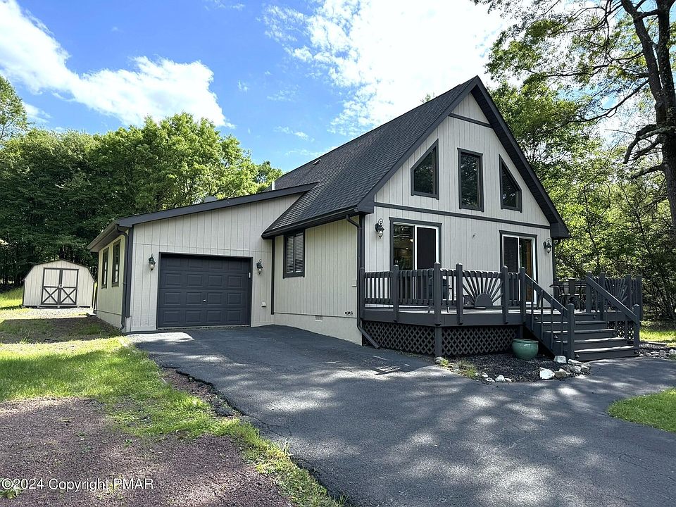 Property is Under Contract and considering back-up offers only at this time. This renovated cozy chalet with an open floor concept and Cathedral Ceilings offers: 3 Bedrooms, 2 full Bathrooms, Loft, Large one car Garage (which can be easily transformed into a Game room), two specious Decks, as well as, a roomy Shed! Luxury vinyl plank throughout the first floor, with newly carpeted Loft & Bedrooms gives that cozy home feel. The Kitchen is with granite counter tops, porcelain tiles backsplash and stainless still appliances.