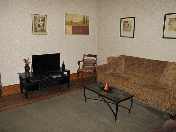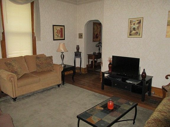 Charming house perfect for person looking for 1st floor living. This home has bedroom, full bath, washer and dryer all on the first floor. Second floor has large 2nd bedroom. Enjoy the covered front porch and flat yard. The hardwood floors in the living and dining room are edged.
