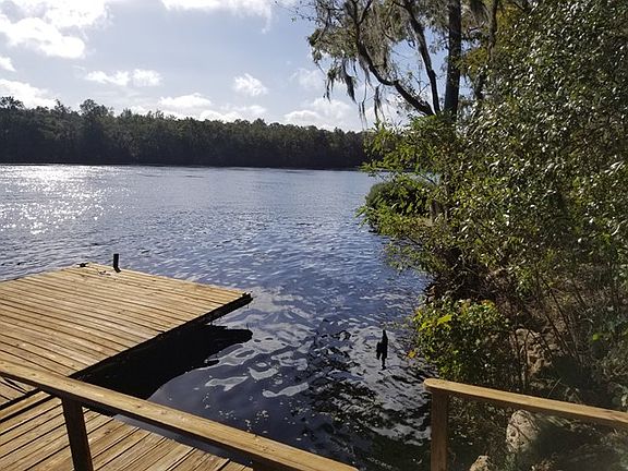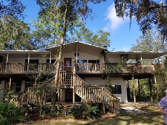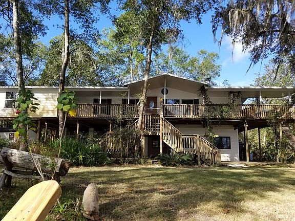 Surrounded by water on three sides, this 1+acre peninsula property is what dreams are made of. Large master bed/bath with river views. Plenty of porches plus additional 12 x 50 bonus room. Storage galore in 1st floor shed/workshop space. 2 docks offer 2 boat parking options. Public boat ramp approx 500 yards away.Fireplace for cool nights , river breezes for hot days. Wonderful retreat on the world famous Suwanee River.