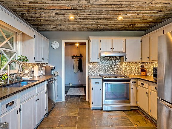 A Wrap Around Covered Porch, full of beautiful plants, welcomes you into this 5 Bedroom and 3 full bathroom Mountain Home. This Southern Charmer boasts over 700 sf Front Deck for enjoying the spectacular views, facing the Sky Valley Golf Course and the best view for the 4th of July Fireworks (see video). The Foyer is adorned with Slate Tile Floors and the ceilings are reclaimed wood from the owner's old warehouse studio in Atlanta. The Kitchen has Slate Tile Floors, Granite Countertops, tile back splash, a Gas Stove with Convection Oven, and Stainless-Steel Appliances. The Dining Area seats 10 people comfortably and is surrounded by large double paned windows to enjoy the magnificent view while eating. The Main Floor Living Room has a real Rock Fireplace with Heatilator, Hardwood Floors, a Built-In Desk with a Dry Bar, and 25 ft ceilings adorned with Hand Chiseled Wood Beams. The Bathrooms may look Retro, but they are original to the home and in great shape. There are 2 Bedrooms on the Main Floor, each with double Walk-In Closets, Carpet, Large Windows, and the Original Diamond Paned Window on the side walls. In the Loft, you will find a large space for an Office or a Sitting Area to gaze out at the tremendous views. There is a large, approximately 400 sq ft Bedroom with a Private Bathroom and closets on the Upper Level, plus there is a magnificent view from this room. Follow the Green Plaid Carpet down to the Lower Level to the Man Cave Den, where you will find a Game Room, complete with another Wood burning Fireplace, Card table, Pool table, and Sliding Glass Doors leading outside. In between games, do a load of laundry in the large Laundry Room. It has a door leading outside, as well. There are 2 additional Bedrooms on the Lower Level, one is larger, with a Built-In Vanity, and access to the full Bathroom. Each of these bedrooms has double Walk-In Closets and the Decorative Diamond Paned Window, as well. The home has a lot of character with an eclectic mix of the original '70s features, along with the updated Cedar Shake Siding and oversized deck, make this a fabulous mountain home. There is Paved Parking for at least 4 cars right at the front step and nice landscaping on each side. Will include some furnishings, minus personal items and family heirlooms. The driveway is scheduled to be resurfaced. With paid membership to the Sky Valley Golf Club, you can enjoy several extra amenities such as Golf, Croquet, Pool, Weight Room, and Private Dining at the Club, but it is not required for you to join. Only 20 minutes to Highlands, NC, and Clayton, GA for grocery stores and restaurants. Only a few minutes to several Wineries, Waterfalls, Ziplining, and Snow Tubing in Scaly Mtn, NC.