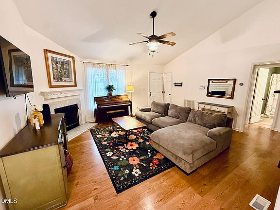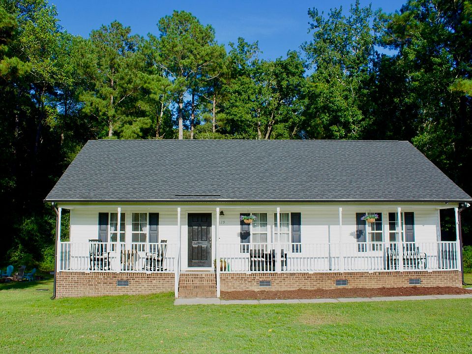 This ranch home in Smithfield lies upon flat earth with large wooded backside. This home boasts fresh paint throughout, new HVAC 2025 and new roof in 2023. A low mow front yard welcomes you into a world of elegant simplicity. Friends or family might welcome you inside while lounging on the front porch. Stepping into the house one is greeted by the open area of the living room with vaulted ceiling, adjacent to the kitchen and dining area. Bay windows beside the kitchen flood the area with natural light. With two full sized bedrooms and bathrooms each occupant enjoys their own private spaces. For the outdoor inclined the acre of property doesn't disappoint. The wooded forest out back coupled with gardening and farming spaces provide a few treats. Just a few minutes to downtown Smithfield, Selma and some neighboring towns brings the small town social environment. Finally, newer features deliver the care free home that many will desire.