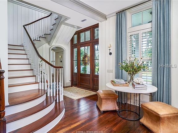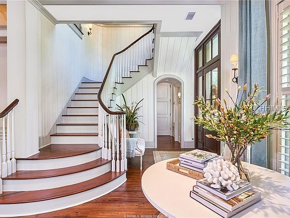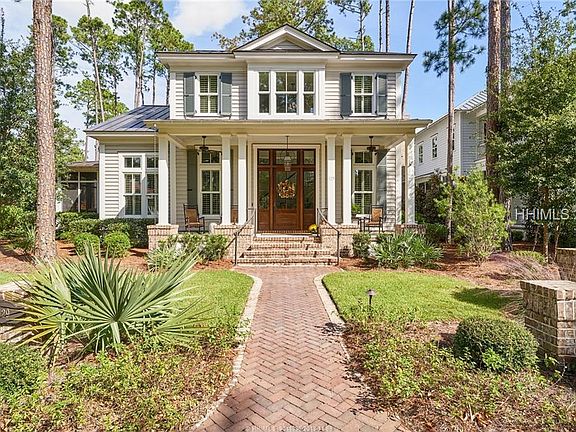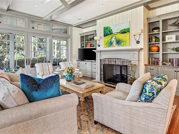 129 Stallings Island South Wilson is a double, corner lot, with views into a park featuring several live oaks. Standing seam metal roof, antique pine floors, high-end appliances and fixtures, beadboard trim on the walls, this home has every upgrade. An open plan featuring a first floor master suite, a serving kitchen/office, a large kitchen that opens to the great room and dining area, which flows out to a large screen porch with a fireplace, built in grill, television. The two large guest suites upstairs have their own bath, and built in bunk beds for additional guests. The property also features a fenced in court yard and a two-car garage.