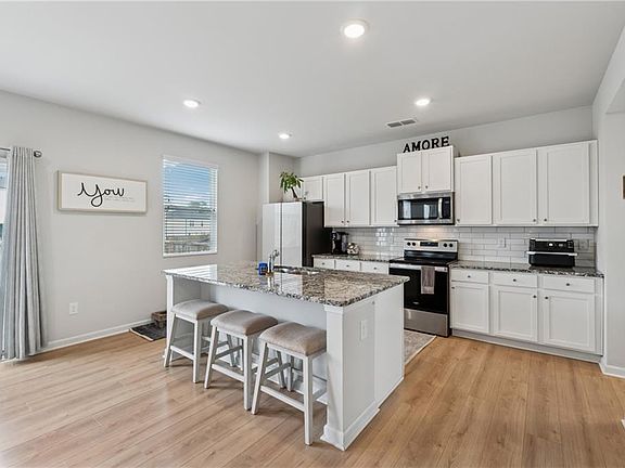 - Features: Cabinets White, Kitchen Island, Pantry, Stone Counters, View to Family Room