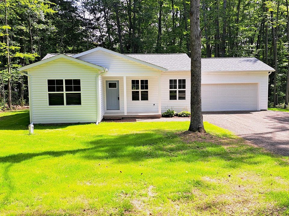 Brand new home is now finished and ready for immediate occupancy!! WALK into perfection - superior wood flooring, white shaker kitchen with granite counters and very functional island. Coffee bar is perfect for your morning java sitting out on your 12 x 16 back deck looking out at the woods and the wildlife. Brick paver patio out back is great for grilling. Place your rocking chairs on the covered from porch and cozy up with your favorite book. Tons of light in this darling home. Attached garage and room foran additional garage. Hi speed internet available. Natural gas and septic.