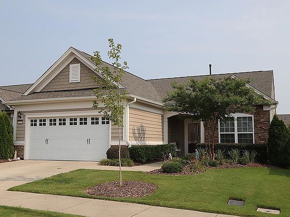 Move-in ready home located in desirable Carolina Arbors 55+ Community! Impeccably maintained Castle Rock floor plan with 2 bedrooms+office located off entryway+light-filled sunroom. Upgraded kitchen including granite counters, gas range with vented hood, roll outs in cabinets, huge island, walk-in pantry, extra cabinet/bar space with sink and beverage fridge. Large primary bedroom with upgraded flooring. Primary bath includes walk-in shower, dual vanity, separate toilet room and linen closet. Primary closet finished with custom built-ins. Secondary bedroom located down front hallway. Guest bath includes a jetted tub. Oversized 2 car garage with overhead storage racks. Fenced backyard with extended patio area. Incredible amenity center included in HOA!