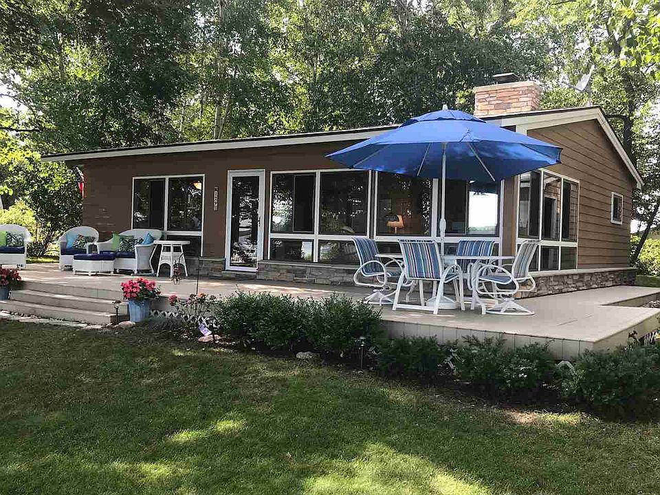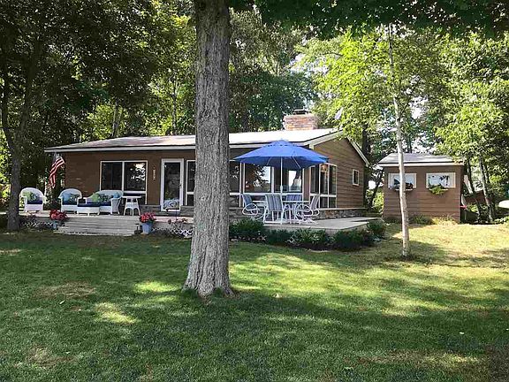 HIGGINS LAKEFRONT on TREASURE ISLAND, 110 feet of gorgeous lake frontage with tremendous views of the lake from the cottage, deck and yard. Beautifully maintained with open floor plan, vaulted ceiling, fireplace and walls of glass. 3 bedrooms, 1.5 baths plus outdoor shower, huge composite deck, large storage shed, spacious front and rear yards. Enjoy the serenity of island living and the convenience of the shortest boat ride from the island association dock and parking area, great spot for swimming with sandy lake bottom and optimum water depth. Offered furnished and ready to move in.