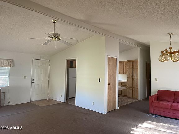 While this home is need of attention and repairs, the views, the larger parking area, and the size of the home are all pluses. The living room is 24 x 14 with a vaulted ceiling that carries through the home. With some palm trimming you could sit on the front porch and see the mountains. There are two nice sized bedrooms, the primary has a spacious full size bathroom attached. Queen Valley has its own golf course which is open to the public but has a few membership spots left. There is a pool at the course too. Another highlight for Queen Valley, there is no HOA! This home may not be move in ready but the potential to make this place your own is ready to go. This home is not affixed, there are 2 parcels in this sale. Please do not walk on the back deck as you enter the home.