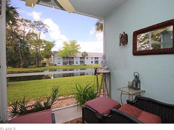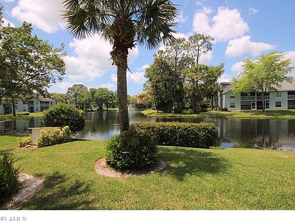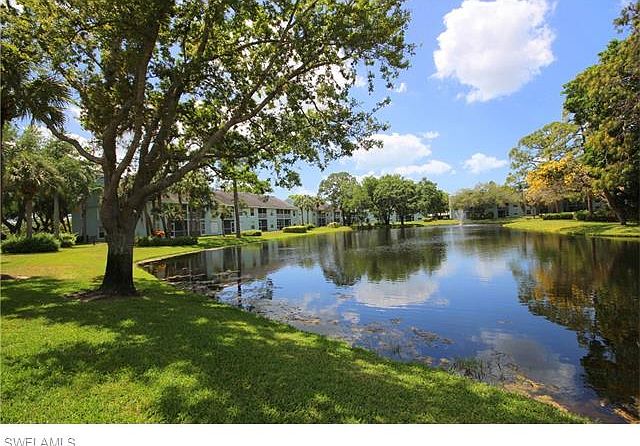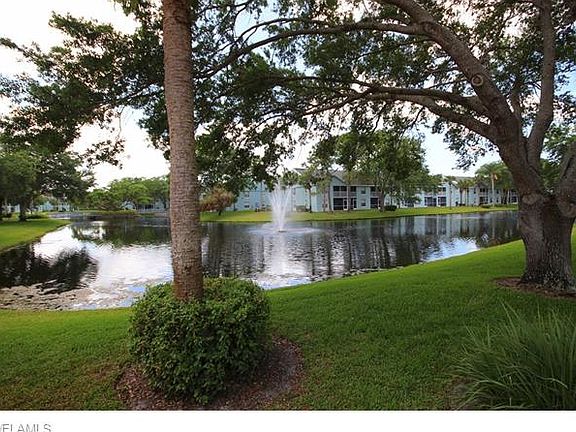 FIRST floor, CORNER residence with beautiful, WIDE water views. Two bedroom plan is a split plan with the Master Bedroom in the rear of the home with walk-in closet, on-suite master bath, and windows on two sides, giving western water views, and the guest bedroom in the front of the home, with the Formal Dining in between. Eat-in kitchen nook has windows, allowing the morning, eastern light to come in, as well as a pass through counter to the great room. Great Room has glass doors leading to screened lanai, and water views of the wrap around lake, fountains, and bridge in the distance. Located in the heart of Palm River with close proximity to everything North Naples - just off Immokalee Road corridor, with easy access to many roads - Goodlette, Airport, Livingston, US 41, I-75, and more. Great location within minutes to Vanderbilt Beach and Wiggins Pass State Park. Amenities in the community include resort style pool, lap pool, clubhouse & community room, fishing pier, bbq, and more! Low condo fees & pet friendly - Not a 55+ restricted community! Covered parking space included - current lease in place until August 2016. Hot water heater and A/C replaced in 2008.