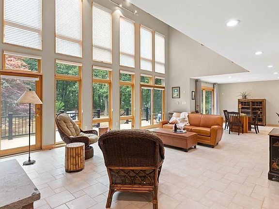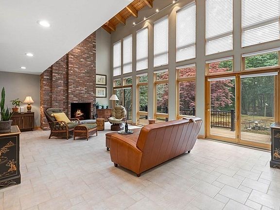 Imagine coming home each day to your own personal private, wooded retreat surrounded by the sounds of nature and the tranquility of the perfect blend of well-thought-out landscaping and untouched natural beauty. The exterior has many items to marvel at, inc a relaxing waterfall w/fish pond, wood benches, lovely walking path & more. The interior of this home is striking & truly encapsulates how a contemporary home should look and feel. Soaring ceilings & an abundance of windows & natural light greet you as well as an open flr plan that invites you in to explore the many custom features. Gorgeous kit w/oversized island & plentiful cabinetry, awe-inspiring living rm w/magnificent floor to ceiling brick fp, 1st & 2nd flr main bdrms each w/ luxurious full, updated bths & a fantastic loft area w/built-in storage. The famly rm w/fp leads to a richly appointed 3-season sunrm and spanning views of the yard. Radiant heat thru-out & massive unfnshd basement w/workshop area & loads of storage.