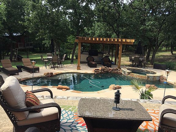 Stunning five bedroom home on over 4 heavily wooded acres with workshop in Decatur ISD! This home has it all! Living room has wood burning fireplace and beautiful flooring, formal dining, kitchen filled with custom cabinetry, center island, double oven, tasteful granite and breakfast area overlooking the outdoor oasis! Great family floorplan with oversized master and bedroom on first floor. Bedroom 3 has private bath while bdrm 4 & 5 share a jack n jill bath.Tons of storage and walk in closets are throughout! Outdoor living space consists of fire pit, outdoor kitchen, hot tub and plenty of room to entertain on mutiple levels! Oversized insulated workshop has pool bath. Don't miss the custom tree house!