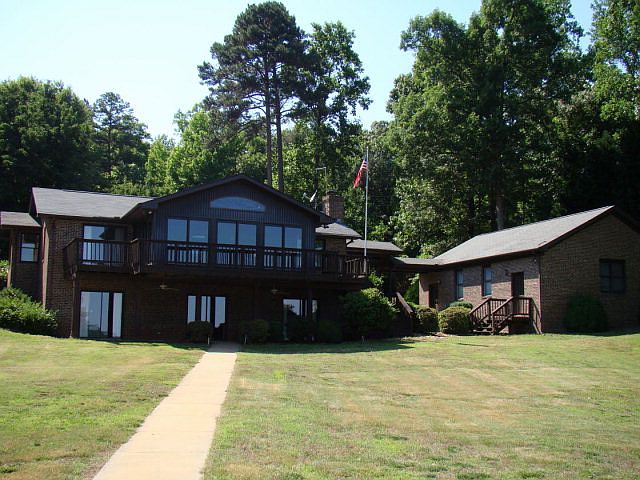 Wonderful BRICK lakefront home with large garage & nice sunroom just off the MAIN LAKE! This home provides lake living at it's best w/ the almost flat lot, bulkhead & double boathouse w/ 7' water depth & awesome lake views! Wide open floor plan with large kitchen, separate dining room and large family room with gas logs. Enjoy the great main lake views from the 24 X 16 lakeside sunroom which was added in 2005 & has portable A/C & Heat. Master bedroom is on the main level & has a very nice master bath w/ whirlpool tub & large walk in closet. Finished basement offers a rec/family room, 2 more bedrooms & flex room that could be used as office or sleeping area. The laundry room is also in the basement and washer & dryer convey. Don't miss the double detached garage/workshop with 1026 sq ft & connected with a nice covered breezeway. Storage building on the lakeside to house water toys, etc.