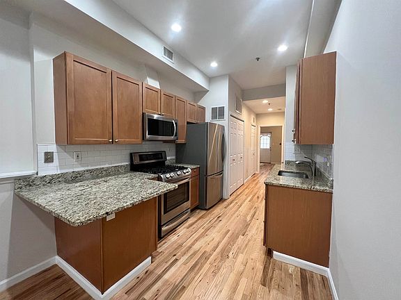 Newly renovated Only 1/2 flight up to 1st floor, parlor level home with private yard! This well-proportioned 1 bed is currently being updated. Be the first to rent with an all-new gut renovated bath, beautifully done in white and grey finishes. The kitchen has new stainless-steel appliances, granite countertops with breakfast bar, new white subway tile backsplash, maple cabinets & pantry closet. Tall windows allow tons of natural light. Other newly updated home features include in-unit washer/dryer, recessed lighting added throughout and refinished hardwood floors (pictures don't show updated floors yet). Control your own central heat & AC. Convenient to restaurants, shops & transportation. Only 5-7 minutes walking distance to PATH station. No pets, this building does not allow dogs. Yard furniture is included with the rental. Tenant pays for their own PSEG for gas/electric. Owner pays water/sewer/trash. Available June 1st.