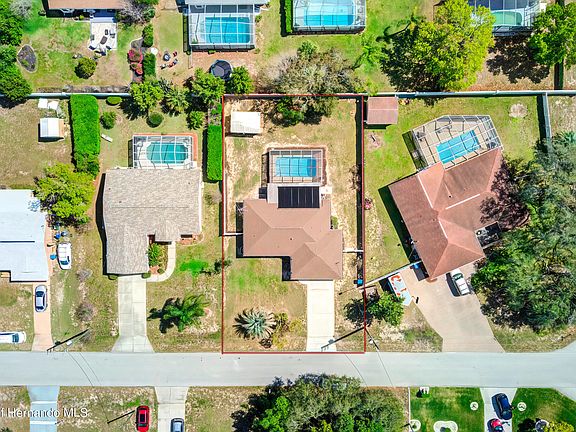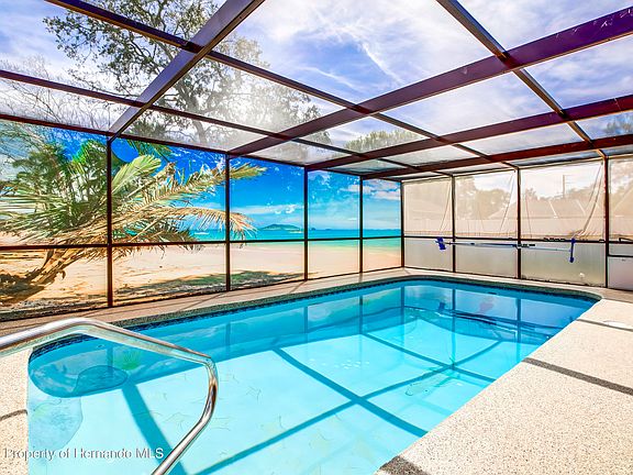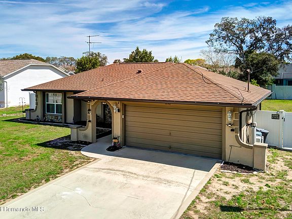 Active under contract, accepting back up offers. Move-in Ready Pool Home! AFFORDABLE and better than paying high rent prices! 100% Buyer's financing program available. Many upgrades in this Pool Home that offers 3 bedrooms, 2 bathrooms, 2 car garage, and a fully fenced backyard! As you enter you will be greeted with an open floor plan that features living room/dining room combo, slider doors replaced in 2011, overlooking the heated in ground pool and screened in lanai. Spacious living inside and out! The kitchen features ample space with plenty of cabinets, closet pantry, tile backsplash, newer refrigerator, newer sink, trash compactor, granite countertops with barstool countertop opens to the Living area! Both bathrooms have new commodes, bidet toilet seats, Granite countertops, tiled showers! Large ceramic tile flooring throughout the home, no carpet! Interior of home was recently painted. Crown molding throughout the home. Master bedroom offers room for a king size bed, a walk-in closet and ensuite bathroom with updated vanity and 2 replaced windows! Bedroom 2 and 3 on opposite side of home. Bedroom 3 has updated window, and room for a closet; use as an office or bedroom. Nice big yard, fenced for your family and pets! Solar Heated Saltwater Pool resurfaced in 2022, beautiful artistic design of dolphins, mermaids and more! The owner recently replaced pool pump, cell, and box; cage rescreened. Huge shed for extra storage. Roof 2021, AC 2013, water softener, septic drain field replaced, solar exterior lighting, ring doorbell and security camera. Great condition, move in ready! NO HOA (homeowners association). NO CDD (community development fee). and not in a flood zone. Located close to shopping, restaurants, hospital, entertainment, conveniently located close to the Suncoast Parkway for work or play! 2012 Sinkhole investigation and stabilization reports available.