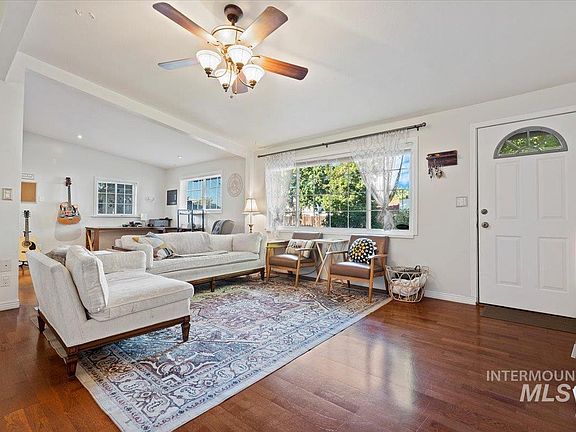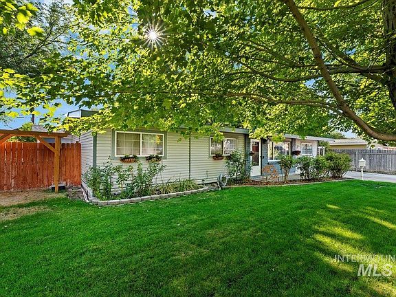 Feel the charm of this delightful mid-century home! Exceptionally situated on a lovely tree lined street in the north end, located a half mile from parks, library and an approximate mile jaunt to downtown. Be greeted by the large front window which invites plenty of natural light into the welcoming living area. Enjoy a great room concept with the spacious living room plus designated dining area along with additional space for entertaining or office set up. The bathroom has been completely renovated with everything new, must see to appreciate! Kitchen offers ample cabinets and counter space with an included reverse osmosis system under the stainless steel sink. Kick up your feet and relax under the bench swing gazebo in this backyard retreat that includes several varieties of grapes, berries and fruit trees along with a covered patio, gazebo, fire pit and extra large shed. There is space for RV parking in the back with alley access and no immediate back neighbors. Experience small town living in Mountain Home!