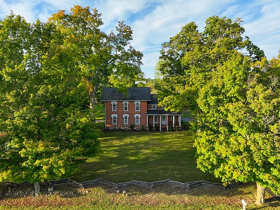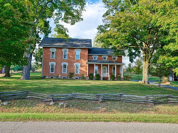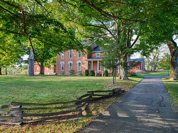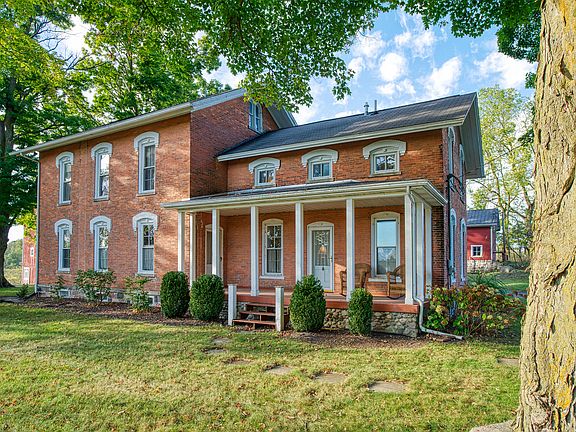Forget the modern farmhouse trend, here's the real deal! This stately double brick beauty was built to stand the test of time. Only 6 families have had the privilege of owning this treasured piece of history and over the years the improvements have been mindful of maintaining the character while adding energy efficiency. The warmth of the wide plank wood floors, the views from the 42'' windows, the sounds of the rocking chairs creaking on the front porch all combine to create a peacefulness the moment you arrive. There is a workshop ready for the next project just outside the back door, a guest house waiting to be restored and an awesome specimen of a barn so you can fully embrace the agricultural heritage of the area. With frontage on 2 paved roads, the 20 acres lends itself to mult generational living. Plan to spend at least an hour when you come tour this property, but you still won't experience all there is to discover!