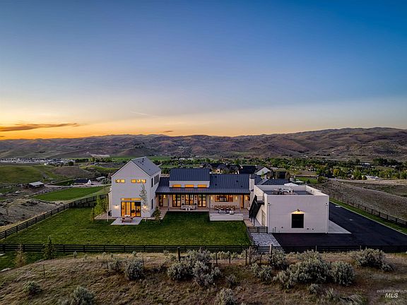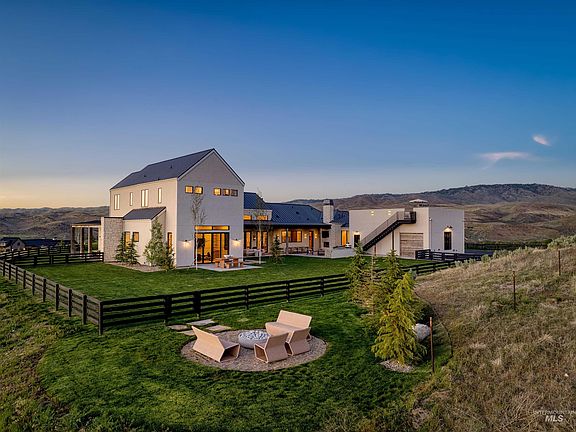 Unparalleled luxurious custom estate with stunning design and captivating panoramic 360 degree foothill views. Perched atop a private gated cul-de-sac on a premiere ~10 acres with ~11 buildable acres for 2nd home/shop/barn (w/no HOA) allows for horses, this residence is truly like no other & offers endless possibilities! Curated by its designer-owner, you’ll find exceptional features throughout, including a dramatic light-filled interior where 20-ft ceilings soar to enhance the spacious & refined floor plan, premium marble finishes, professional-grade Thermador appliances, custom built-ins, and gorgeous bar. The exclusive main level primary suite invites you to enjoy warm fires, wildlife viewing & sunsets on the private patio & indulge in the spa-inspired steam shower, sauna & dedicated gym. Exterior spaces offer multiple patios w/fireplaces, a rooftop terrace & outdoor kitchen—for the ultimate in living and entertaining. Just mins to dining, shops, trails, equestrian facilities & golf courses. Idaho Dream!