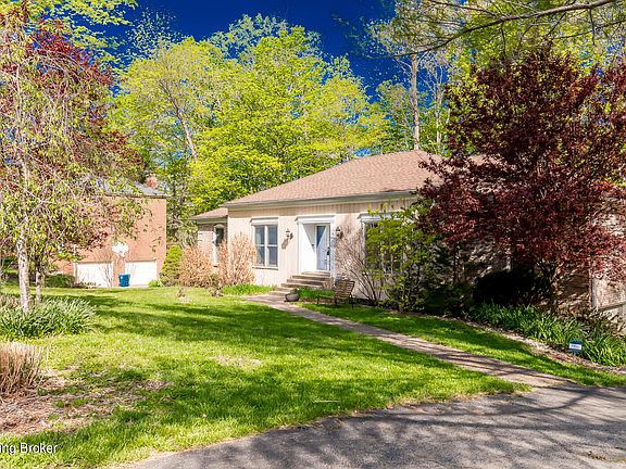 This home perfectly blends the indoors with a large, wooded, fall-away lot, stream and a wooded hillside in the distance. With three bedrooms up, one down, and three full baths, this walk-out ranch offers an open floor plan, one-floor living if desired, additional family room, office/bedroom w/full bath downstairs and a large 2.5-car garage. Extra finished room in basement has been used as BR and has closet/walk-through to Jack-&-Jill bath, plus large storage room. Multi-tier deck highlights the outdoor beauty. Lower level has sink, cabinets, fridge- this level could be suite for family member. 'Handyperson' garage with storage/ mechanical room. Oldham K-12 schools between home and Hwy 42. Please see photo gallery and make appointment right away. Homes with views like this are rare! Seller replaced all windows in home about nine years ago with high-quality double-hung Marvin product.