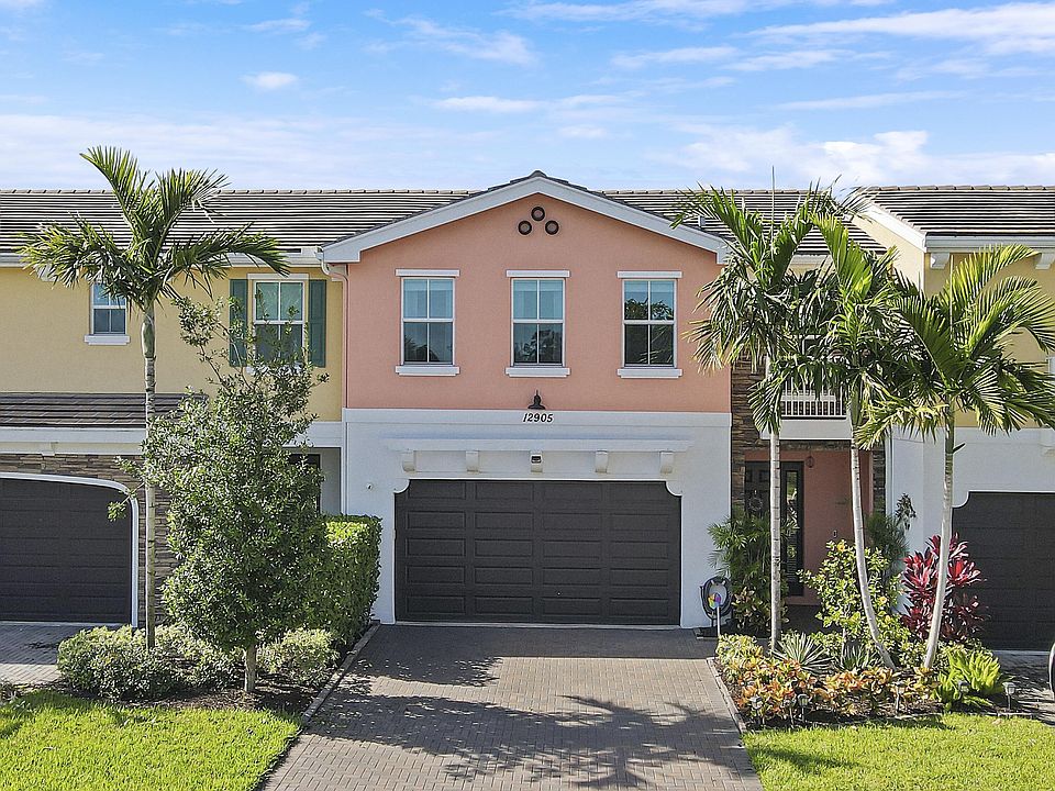 Welcome to 12905 Trevi Isle, a stunning townhouse nestled in the heart of Palm Beach Gardens. This exquisite residence offers 1,932 sq ft of thoughtfully designed living space, featuring 3 spacious bedrooms, an upstairs loft space, perfect for an office, and 2.5 bathrooms. Step inside to discover architectural elegance with high ceilings that create an airy and sophisticated atmosphere. The home boasts water views and a western exposure, allowing for beautiful sunsets. Enjoy automated porch screens that create a bug free outdoor space, perfect for cooler days and nights where you want to open your patio doors and enjoy the outside. Soundproof windows and window treatments ensure a peaceful and private environment! This 2021 home is gorgeous, immaculate and move in ready. The open kitchen is a chef's delight with a central island open to the living and dining areas.