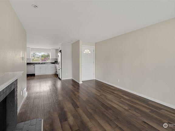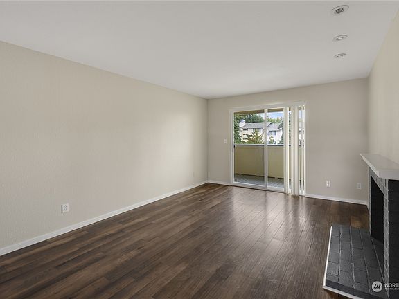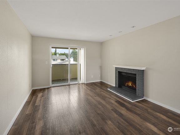 This charming top-floor condo boasts 2 bedrooms and 1 full bathroom, a master bedroom with a spacious walk-in closet, a large kitchen with Quartz Counters, Stainless Steel Appliances, and White Cabinetry, a very spacious living room features a wood-burning fireplace and slider to balcony with Territorial and Courtyard Pool Views. The community offers an outdoor pool, hot tub, sports court, and clubhouse. Storage unit on the balcony, pets ok subject to restrictions. New flooring in bedrooms and bathroom, freshly painted, and is in move-in condition. Perfect for first-time buyers or rental investors. Convenient location just minutes from amenities, Boeing Paine Field, Alderwood, Park & Ride, I-5.