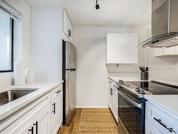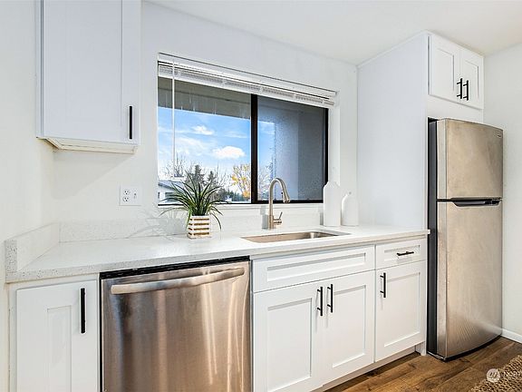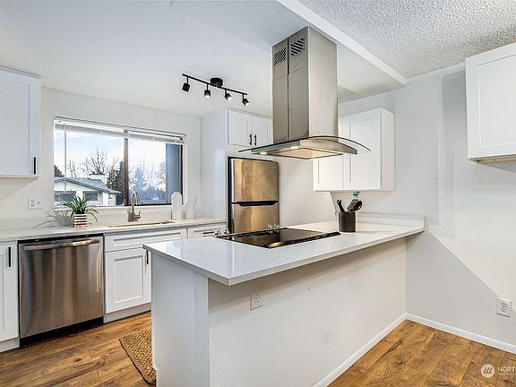 A perfect, remodeled top floor condo is waiting for you! This tough to find 2 bed, 2 FULL bath unit features new laminate hardwood flooring, kitchen w/stainless steel appliances, quartz countertops, island cooktop & stainless cooktop hood. Dining area is open to living room w/wood fireplace & covered deck & storage. Primary bedroom w/large closet + full en-suite bath w/tiled floors, updated vanity & quartz countertops. The full main bath also features an updated vanity & tiled floors. Laundry w/full size washer & dryer included! Homestead amenities include swimming pool, covered hot tub, clubhouse & athletic court. New roof 2023, hot water heater 2022, easy I-5, 405 & Boeing access & convenient location close to restaurants & shopping!