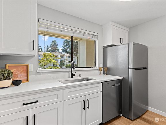 This is it! Immaculate remodeled 2 bed 2 full bath condo is move in ready. Brand new kitchen, quartz counters, never used stainless appliances, modern adjustable lighting, fresh paint/hardware, & lifetime warranty Stanta Ana Luxury Vinyl Plank flooring throughout (No dusty/dirty carpet to ever replace). Primary bedroom features own full bath & large closet. Includes washer/dryer in laundry room off of Full 2nd bath. Bright living space w/ wood fireplace opens to private covered deck w/ storage. Take a dip in perfect sized pool on hot days w/ indoor & outdoor hot tubs on cold days. Athletic court, Cabana, Community garden. Close to everything: Restaurants, grocery, ParkNRide, I5. NO RENTAL CAP or assessments. Buyers to verify all info