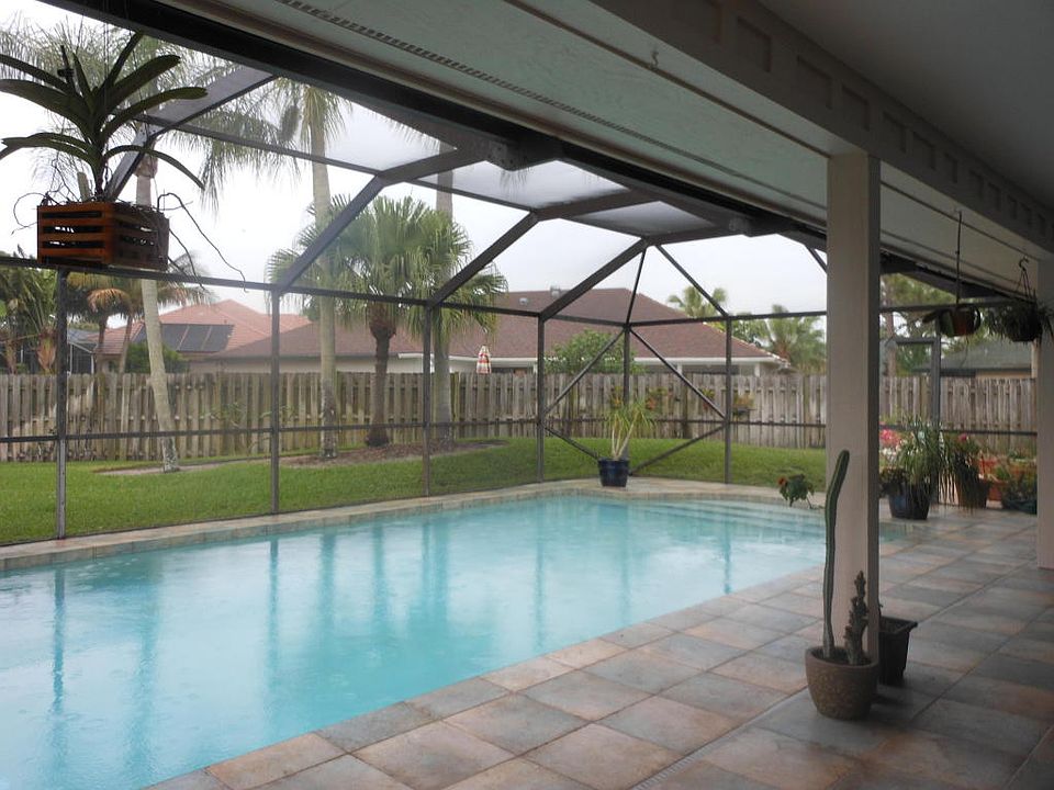 Spacious 1 story home on huge lot. This home has a great room, volume ceilings plantation shutters. Exterior newly painted. Oversized kitchen with new cabinets and granite tops. New air handler and condensing units in 2013/14. Extra large laundry room. Folding hurricane shutters. Slate decking around heated pool with large overhang area.Oversized 2+ car garage.