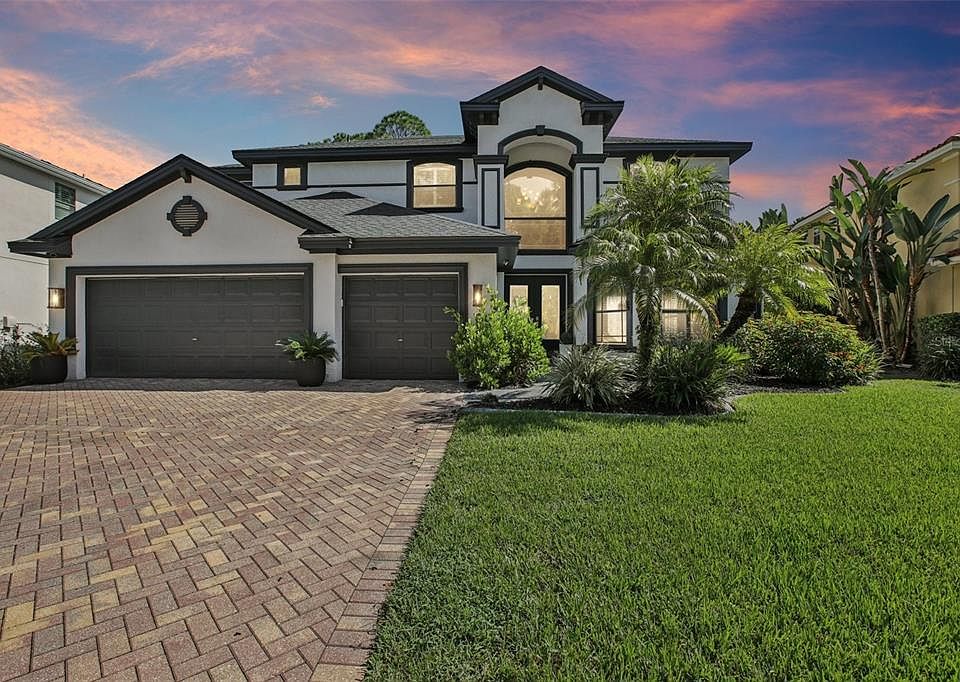 One or more photo(s) has been virtually staged. Welcome to this stunning Jeff Larson–built home in the sought-after Nine Eagles community, offering 4 bedrooms, 3 full bathrooms, 2 half bathrooms, and a sparkling pool with serene pond views. Inside, the open and inviting floor plan showcases soaring tray ceilings, a cozy fireplace, and custom built-in cabinetry in the spacious living area. The chef’s kitchen is designed for both style and function with a breakfast bar, center island, granite countertops, cherry cabinetry, and a casual dining nook overlooking the lanai. A formal dining room near the entrance sets the stage for memorable gatherings. The main-floor primary suite includes a private exit to the lanai and a spa-inspired bath with dual vanities, a soaking tub, separate shower, and walk-in closet. A convenient half bath on the main level adds extra practicality, along with the laundry room. Upstairs, a loft overlooks the great room below. A generous bonus room upstairs has an ensuite bath, and a closet just outside the room, or the wet bar could be converted to a closet, making it an additional primary suite. Two more bedrooms share a Jack and Jill bath, creating a thoughtful layout for comfort and convenience. Outdoor living shines with a fabulous beach-style pool and spa featuring a fountain, paver decking, and a poolside half bath. The lanai is the perfect retreat, offering peaceful views of the pond. Additional features include a 3-car garage, a brand-new HVAC system, and a 2024 roof. Nine Eagles offers a lifestyle to match, with amenities such as a golf course, clubhouse, tennis courts, basketball courts, and playgrounds. Don’t miss the opportunity to own this exceptional home—your dream Florida lifestyle awaits!