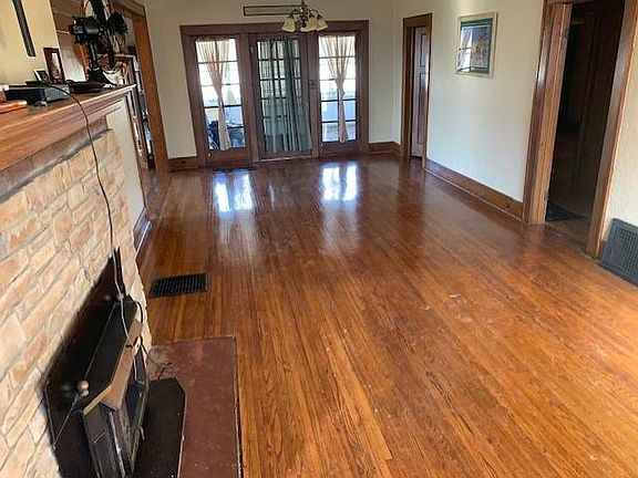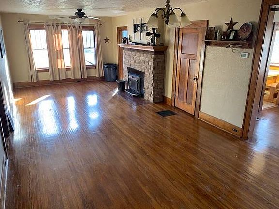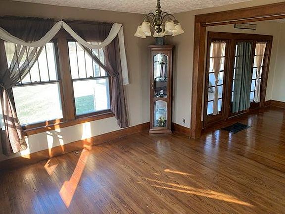 Entrance: Glassed in front porch overlooks yard and road. Living Room: French doors open to huge living room, hardwood floors, stone fireplace with insert, natural woodwork. Storage closet. Dining Room: Sunny and bright. Hardwood floors, painted walls, natural woodwork. Kitchen: Lots of hickory cabinets and planning center. All appliances stay. Vinyl floor. This kitchen opens to butler's pantry with a coffee booth that overlooks the west yard and bay window. Plus more hickory cabinets. Bedroom: Painted walls, nice natural woodwork, hardwood floors. Bedroom: Painted walls, nice natural woodwork, hardwood floors. Bath: Cream fixtures, nice vanity, storage closet. Lower level: Split entry. Stairs lead to basement. It's a walkout basement. One bedroom and one hobby room. The rest of the basement is open and offers storage, laundry area, and work shop area. Gas forced air furnace, central air, water heater, walk out door leads to back yard on south side. Huge deck on west side of house. Lot is just under an acre in size.